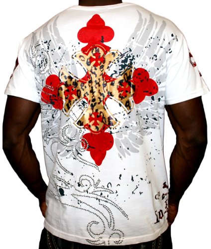 Christian Audigier is the ultimate in mens high fashion, urban street wear! His SMET line is designed with Rock and Roll in mind, particularly French Rock and Roll legend and partner in design, Johnny Hallyday. The catch phrase of SMET- "Born on the Street"- was developed to pay homage to Hallyday's roots, as well as a metaphor for the origin of his innovative ideas. The front of this tee features a winged animal print foil logo and the back features a winged animal print foil and flocked cross. Foil accents, rhinestones and studs accent the tee. Made in the USA. 100% Cotton. Machine wash, tumble dry. Style # C9BBJHWE.